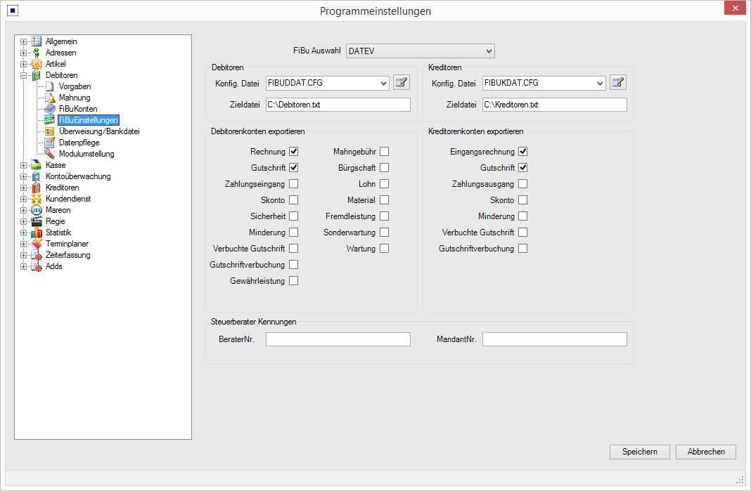 Übergabe der Rechnungsdaten aus Debitoren und Kreditoren an eine der marktüblichen Finanzbuchhaltungs-Programme. Mit flexiblen Möglichkeiten der Eingrenzung. Frei konfigurierbar per CFG-Skript.