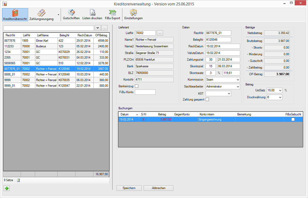 Mit diesem Programm verwalten Sie die Kreditoren (Rechnungen und Gutschriften), buchen Zahlungsausgänge (per Überweisung, Datenträger, Scheck oder manuell) und drucken Rechnungseingangslisten oder Zahlungsvorschlagslisten.