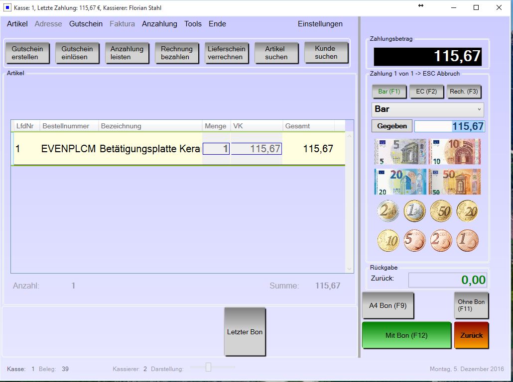 Die Kasse unterstützt zwei Zahlungsarten pro Kassenvorgang. Sollte der Barbetrag nicht ausreichen, können Sie den restlichen Betrag per EC Zahlung begleichen.