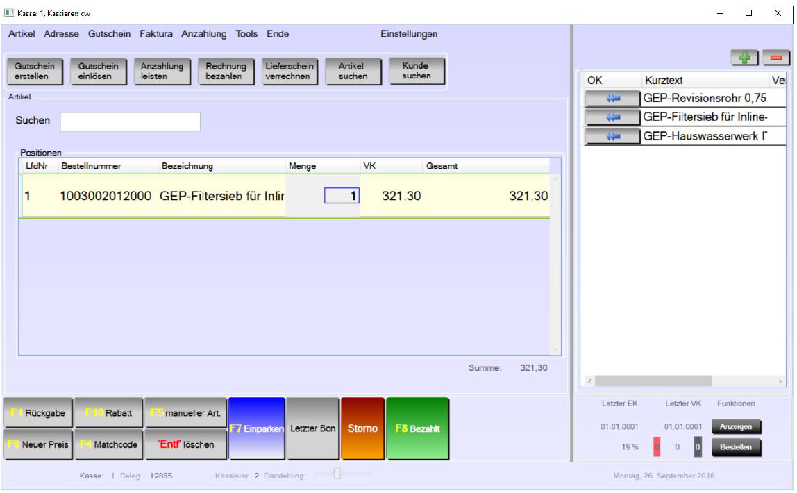 Sie können Artikel scannen oder per Tastatur aufrufen. Auf der rechten Seite steht eine individuelle Liste mit Artikeln, die Sie häufig benötigen, bereit.