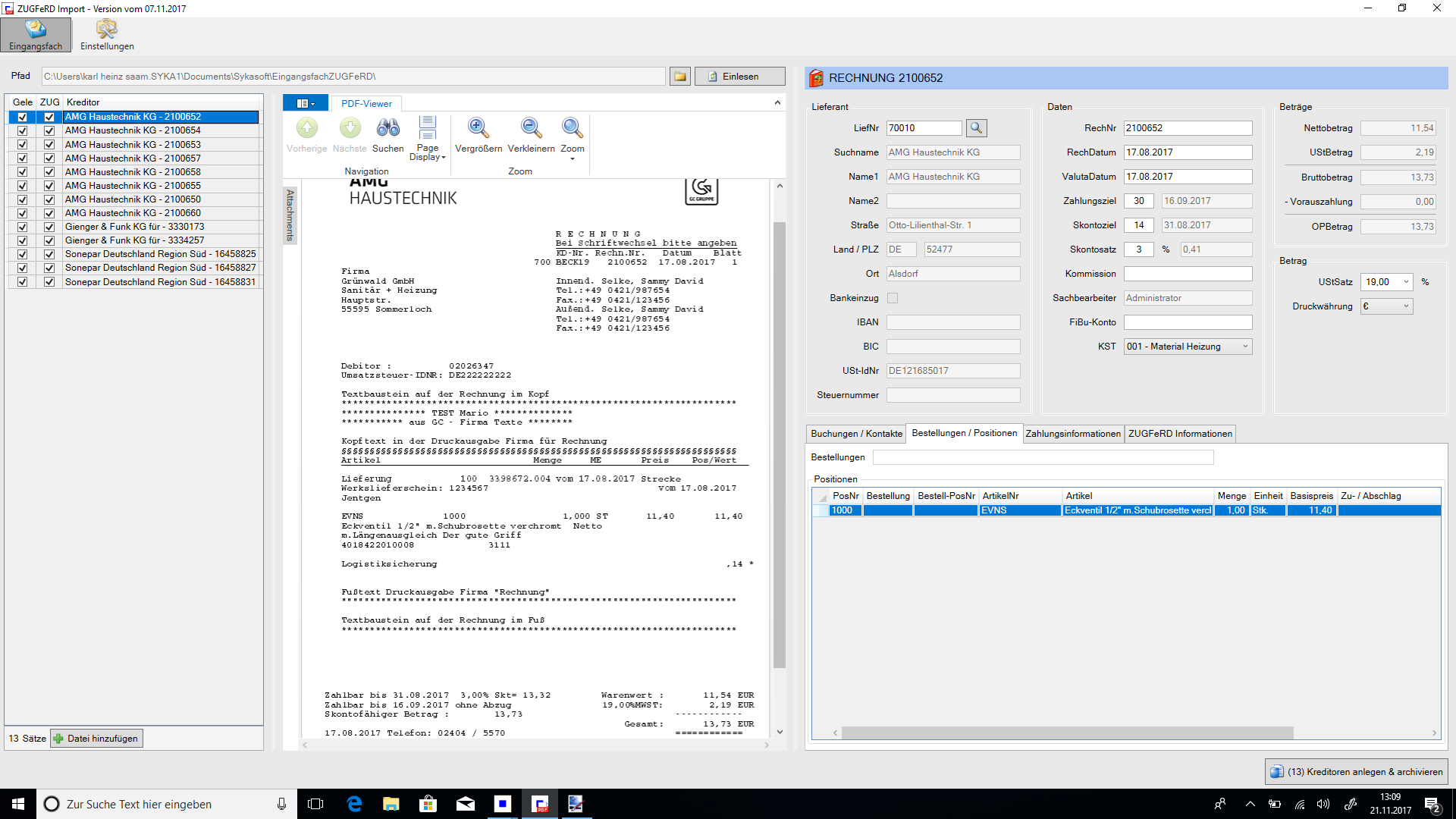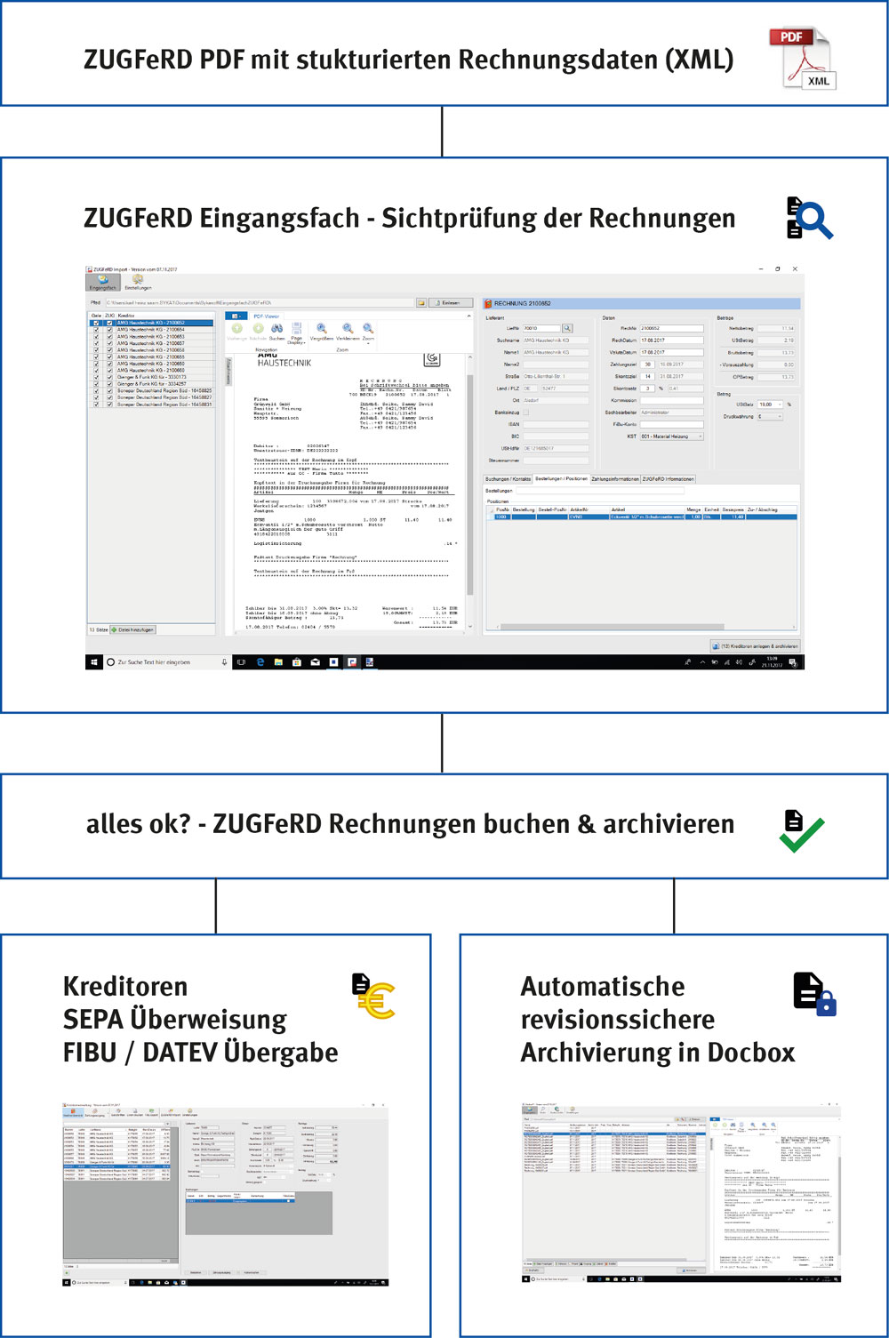 Im ZUGFeRD Eingangsfach (anzuwählen über Kreditoren oder das Docbox Eingangsfach) werden die Rechnungen gesichtet. Neben der PDF Dokumentenvorschau werden die daraus ausgelesenen XML Daten dargestellt (Datenvorschau). Dies ermöglicht den direkten Vergleich der Druckversion und der integrierten XML-Daten. Über die Ust-ID wird die Zuordnung zu Kreditoren hergestellt; neue Adressen werden automatisch angelegt. Bei vorhandenen Bestellungen wird automatisch geprüft, ob die Preise stimmen.