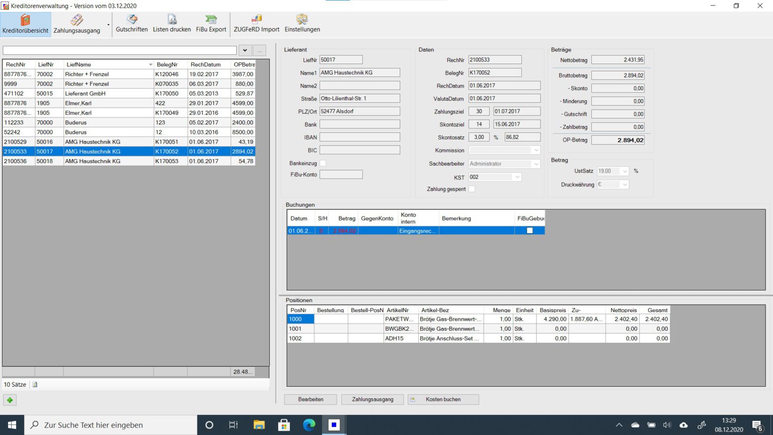 Verwaltung von Eingangsrechnungen, Zahlungsvorschlagsliste, Überweisungsträger, Scheck, E-Überweisung, FIBU-Schnittstelle und Buchen in Bestellwesen.