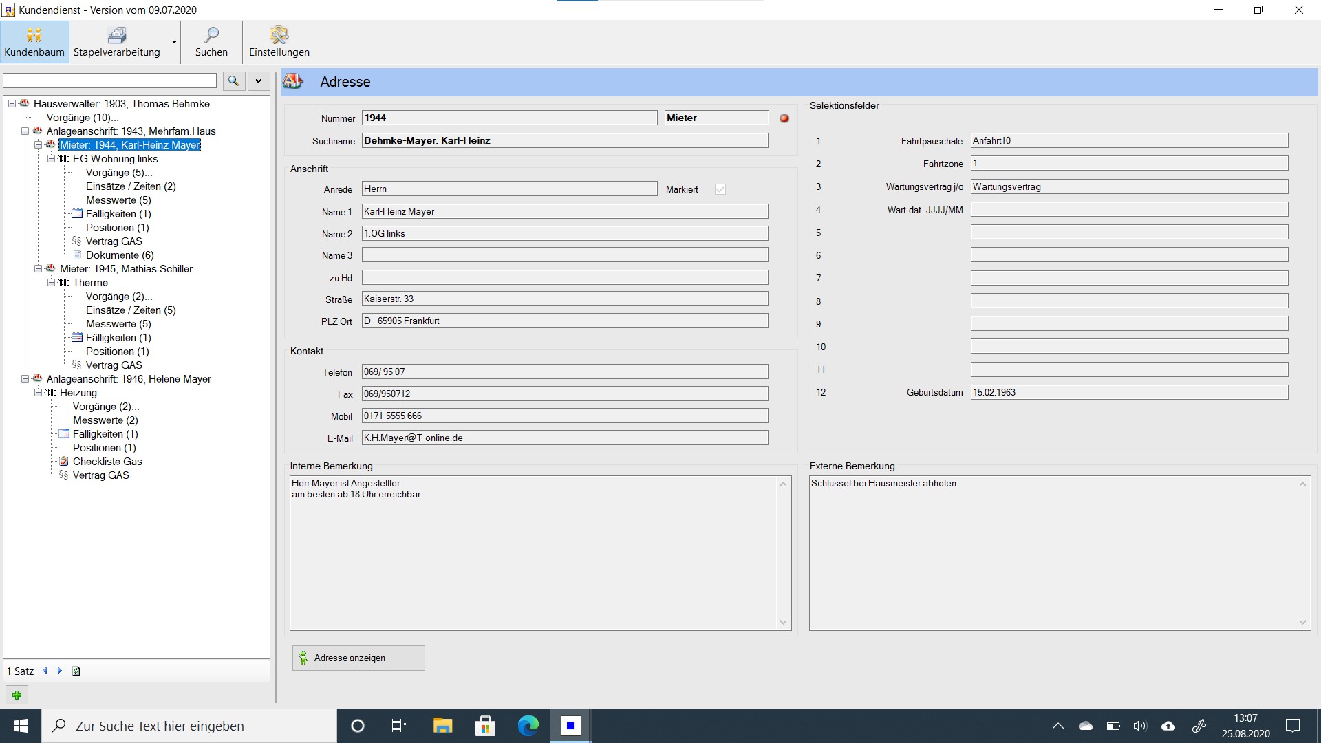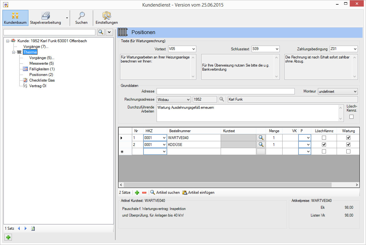 Im Programm Kundendienst werden den Adressen die Kundendienst-Objekte und Leistungen zugeordnet: Vorgänge zu Kunden und Anlagedaten mit technischer Ausstattung, Messwerten, Vertragsdaten, Fälligkeiten, Positionen, vorgegebenen und individuellen Checklisten, Dokumenten und Bildern.