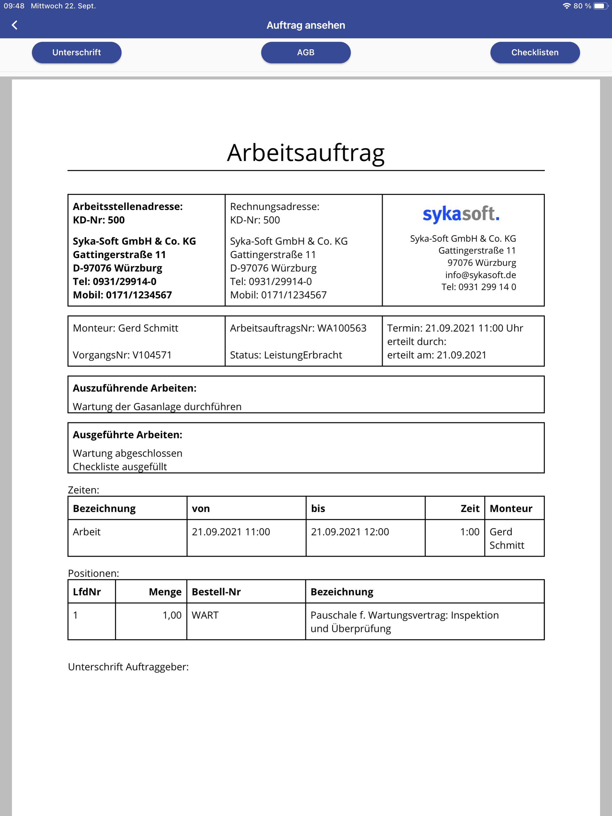 Die sykasoft App für mobile Aufträge wird in Verbindung mit der sykasoft Branchenlösung eingesetzt. Aufträge können aus dem Büro empfangen oder selbst neu angelegt werden.