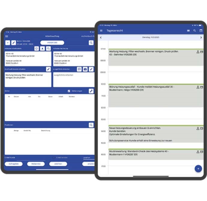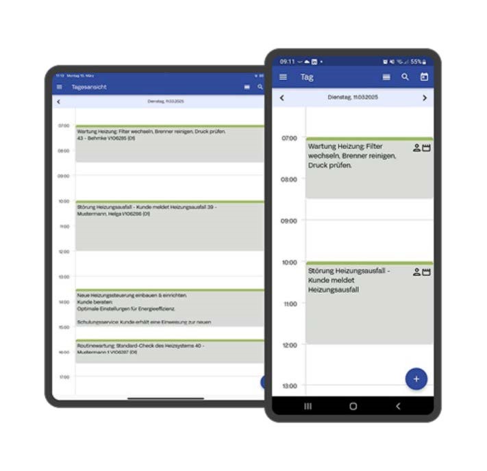 Termine können vom Büro aus erstellt, geändert und auf mobile Geräte übertragen werden. Umgekehrt lassen sich vor Ort neue Termine anlegen oder bestehende verschieben. Ebenfalls ist der Abgleich mit dem mobilen Arbeitsauftrag integriert, sollte dieser auch angemeldet sein.