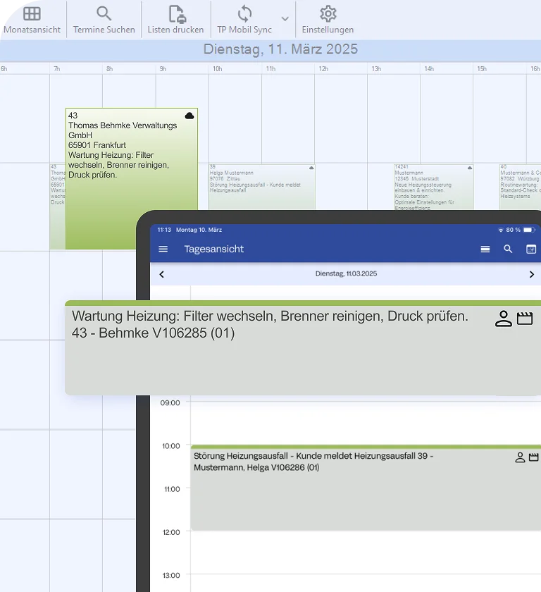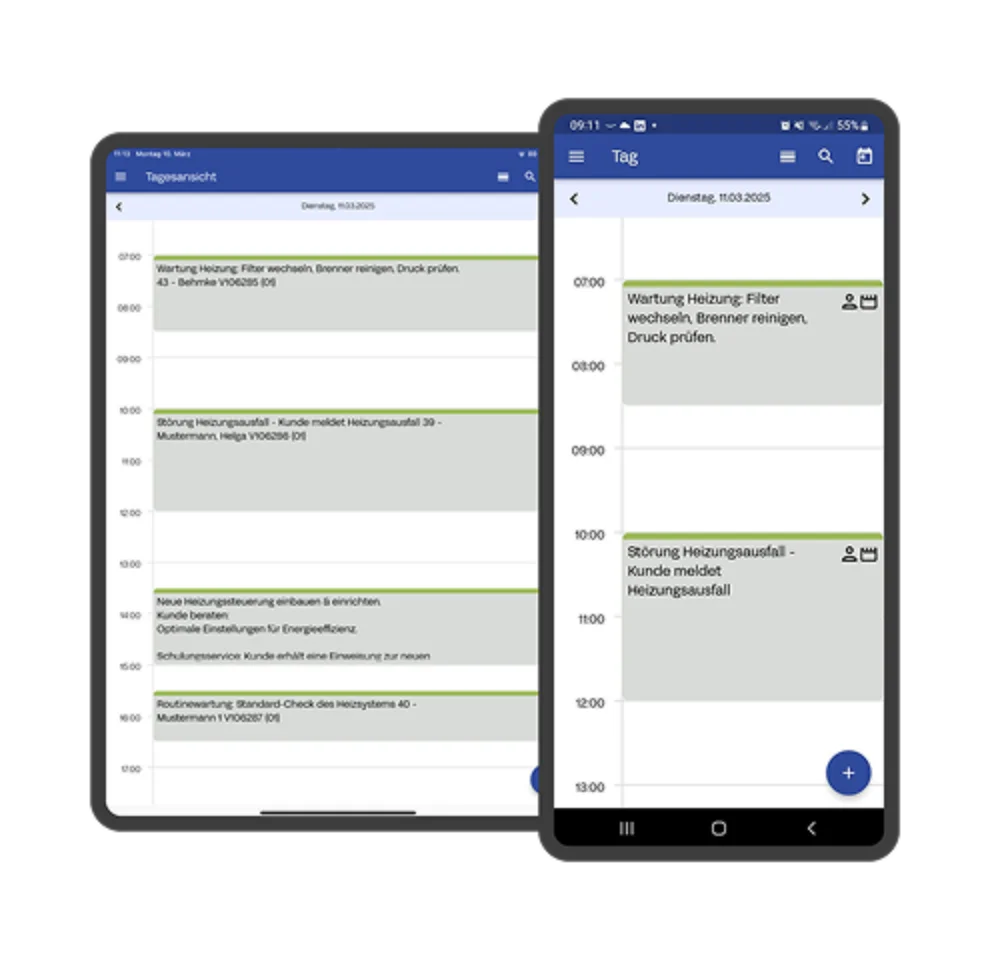 Mit der neuen Terminplaner-Erweiterung haben Sie alle Einsätze immer im Blick – egal ob im Büro, auf dem Tablet oder Smartphone. Dank der automatischen Synchronisation sind Ihre Termine jederzeit aktuell..